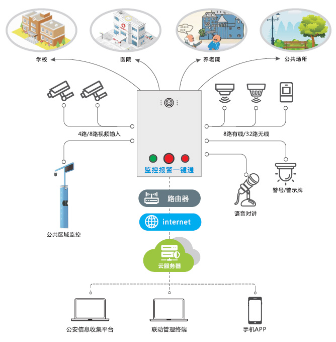 校园一键式紧急报警系统是基于云计算、物联网技术、移动互联网技术为一体的专门适用于在校人员紧急求救的视频报警联网平台。此平台集视频报警、语音报警、联网报警、报警定位、网络报警、电话线报警为一体,具有报警及时性、方便性、隐蔽性、自动弹出报警定位 等功能,极大的解决了现有报警系统的问题缺陷,实时满足了在校人员的报警需求。一键报警设备主要安装在校园的门卫、操场、宿舍、餐厅、教学楼、卫生间、报告厅、图书馆等地,根据不同的场合安装相应的设备。在发生突发事件、群体事件、恐怖事件时便于师生报警求助。
